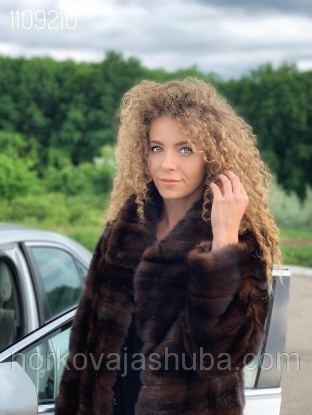 Стильная норковая шуба натурального коричневого окраса подходит на размер 40 42 44. Модель шубки прямая, подчеркнуть силуэт можно вшитой на талии кулисой. Рукава прямые поперечные стандартной длины. Воротник стойка, можно застегивать под горло на скрытый крючок или же носить как отложной. Длина шубки 82 см.