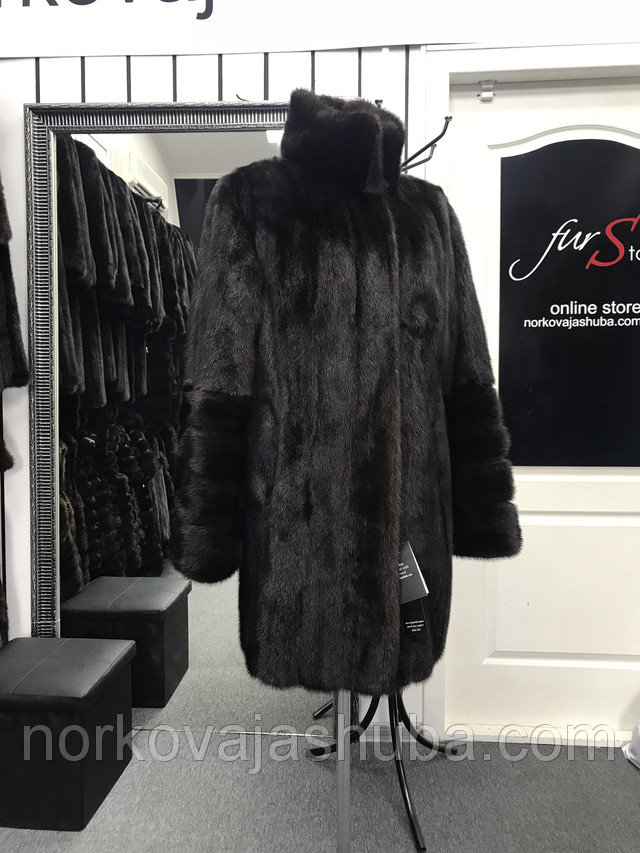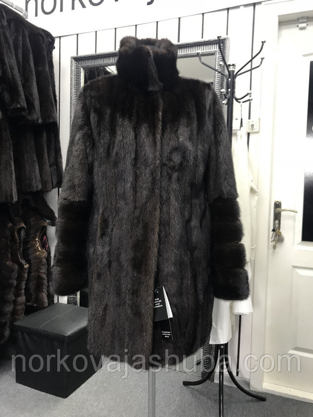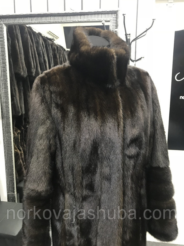 Красивая норковая шуба натурального темно-коричневого окраса махаон маленького размера, подходит на 42 44. Модель шубки прямая, приталивается силуэт вшитой на талии кулисой. Воротник стойка, дополнительно можно застегнуть скрытым крючком под горло. Рукава прямые, снизу декорированы отрезными широкими манжетами. Длина 84 см.