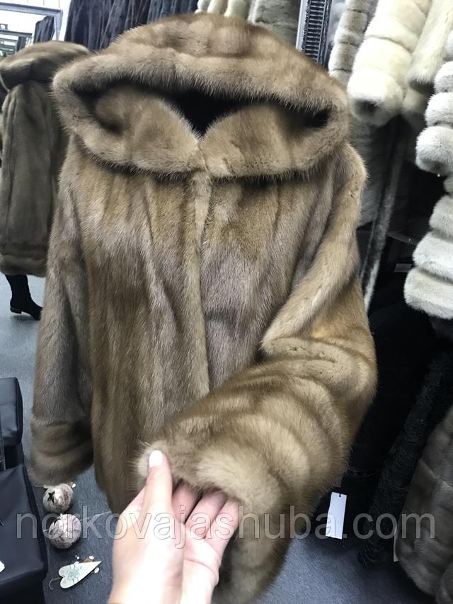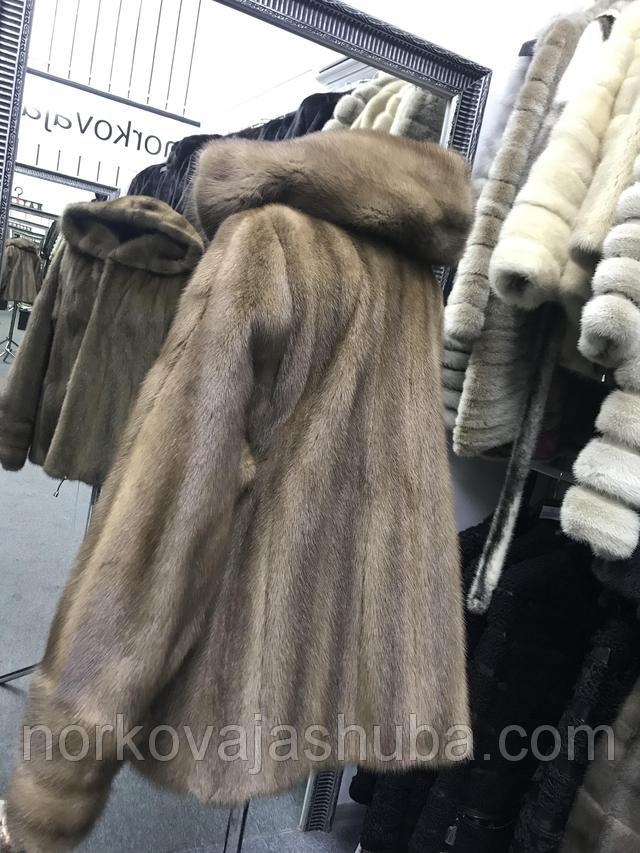 Красивая норковая шуба полушубок с капюшоном из канадской норки натурального светло-бежевого окраса подходит на размер 46 48. Модель шубки -небольшой клеш, низ шубки регулируется вшитой кулисой. Капюшон меховой -объемный и глубокий, можно носить с отворотом или же без него. Рукава прямые стандартной длины снизу украшены отрезными поперечными манжетами. Длина полушубка с капюшоном 68 см.