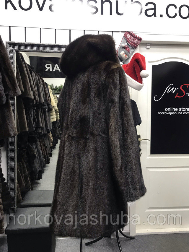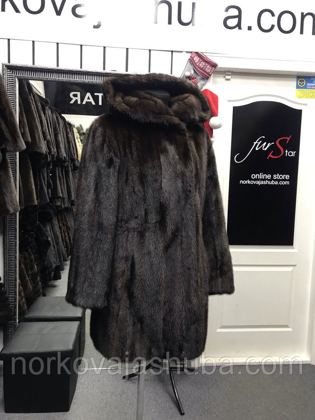 Женская норковая шуба с капюшоном натурального темно-коричневого окраса подходит на размер 44 46 48. Модель шубки прямая, притаивается вшитой на талии кулисой, придавая зимнему образу женственности и утонченности. Рукава прямые втачные длина 7/8. Капюшон -глубокий и объемный, можно носить с отворотом и без. Длина шубки 82 см.
